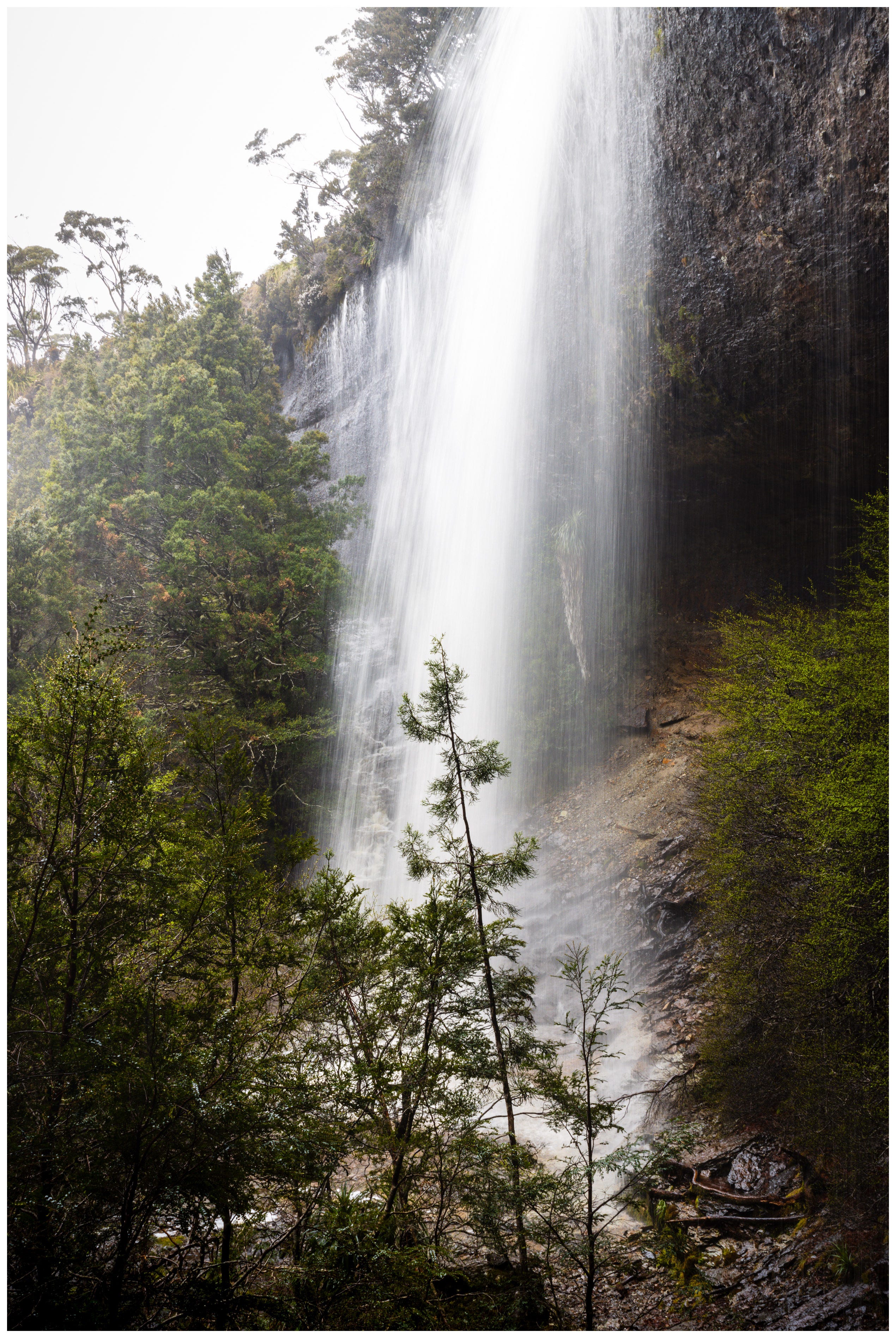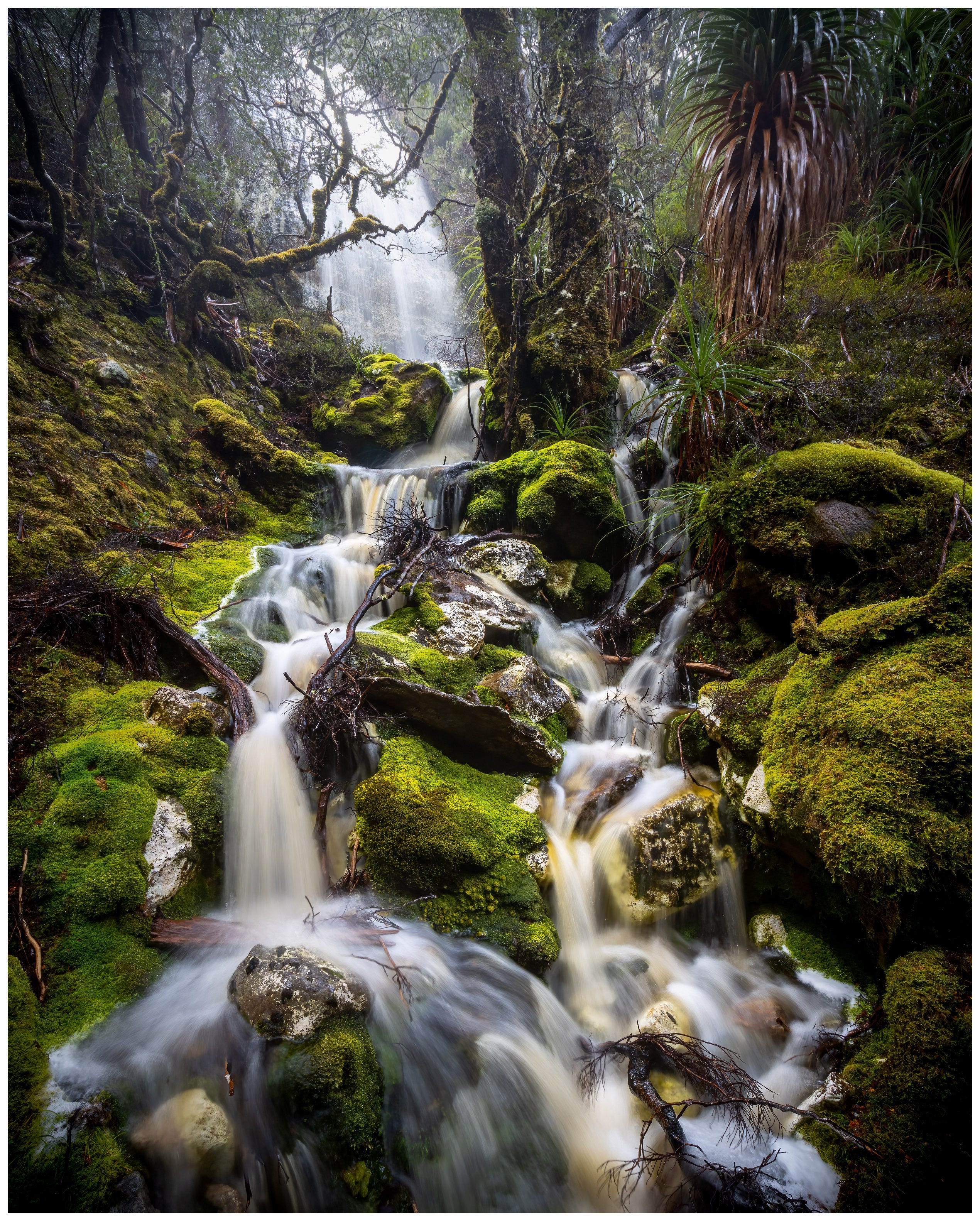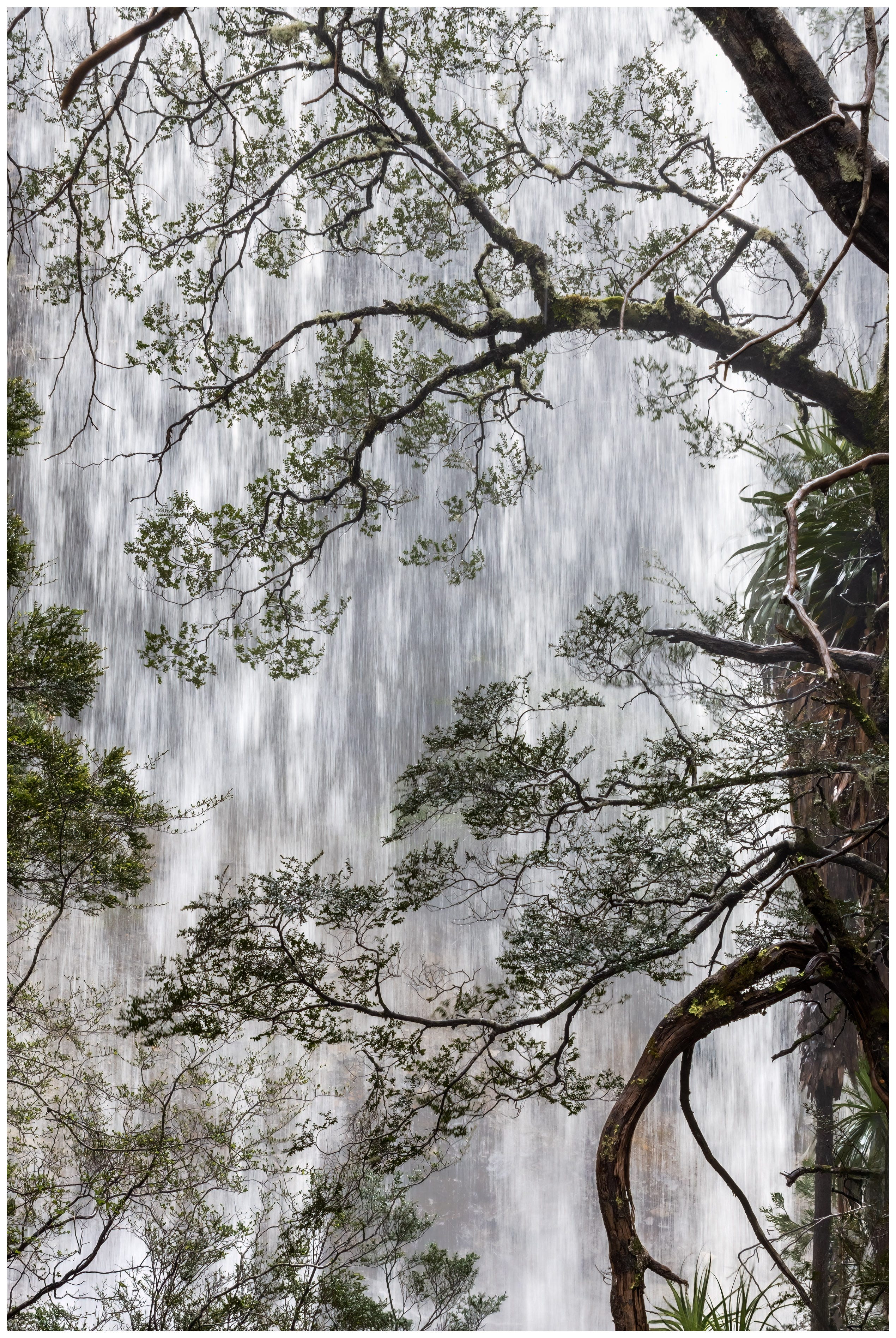 With water coming in from three directions, and water dripping from ancient myrtle and pandani, the rain, mist and spray combined to create a magical atmosphere. I spent a wonderful hour exploring the end of the gorge, trying to capture the dynamism of the water amid the seemingly timeless vegetation so well adapted to an ancient landscape.