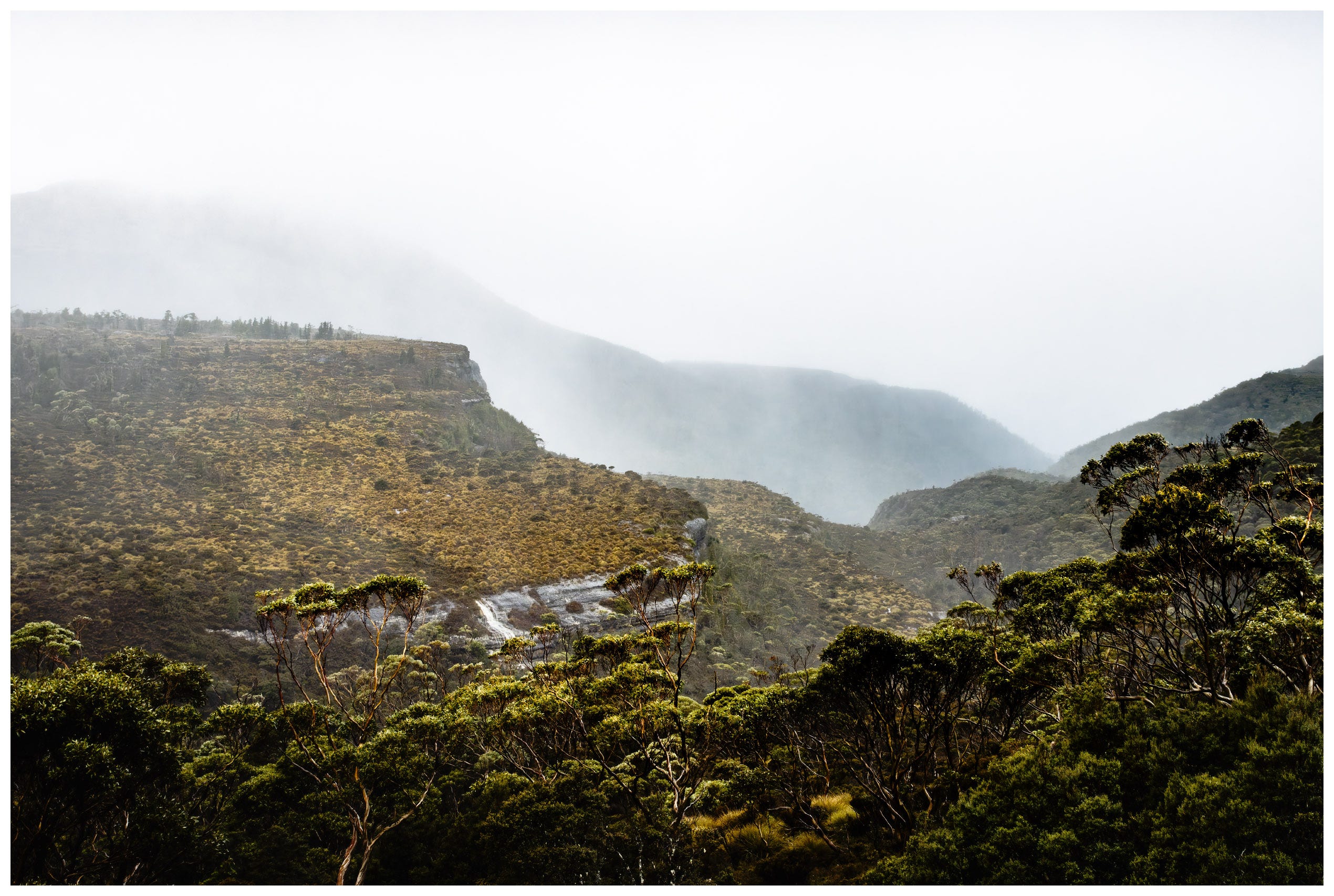 Waking up early, I was not surprised to see that, like the day before, the weather was overcast with low cloud and steady drizzle, with the occasional heavy shower. The second day of walking on the Overland Track is only 12 kilometres or so, including a side trip to Lake Will, so I had planned to spend the morning exploring Waterfall Valley.